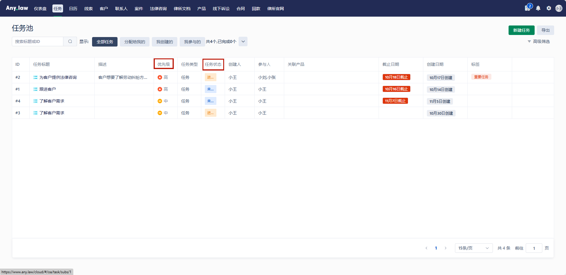 新建完成的任务就会出现在任务列表里,任务的优先级、状态等等,都一一显示在列表中。
